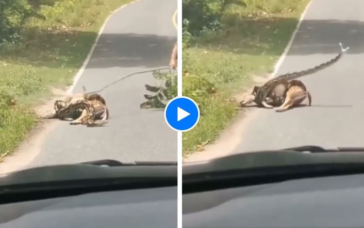 सांप और हिरण के बीच जिंदगी और मौत की जद्दोजहद काफी समय से जारी थी. विशाल अजगर हिरण को पूरी तरह अपने काबू में कर लिया था. हिरण लाचार होकर मौत का इंतजार करने लगा था. इसी बीच सड़क से गुजरते एक शख्स ने दोनों की जंग देख ली. उस शख्स ने हिरण की मदद करने की सोची, और पास के किसी पेड़ की एक शाखा तोड़कर उससे सांप को मारने लगा.