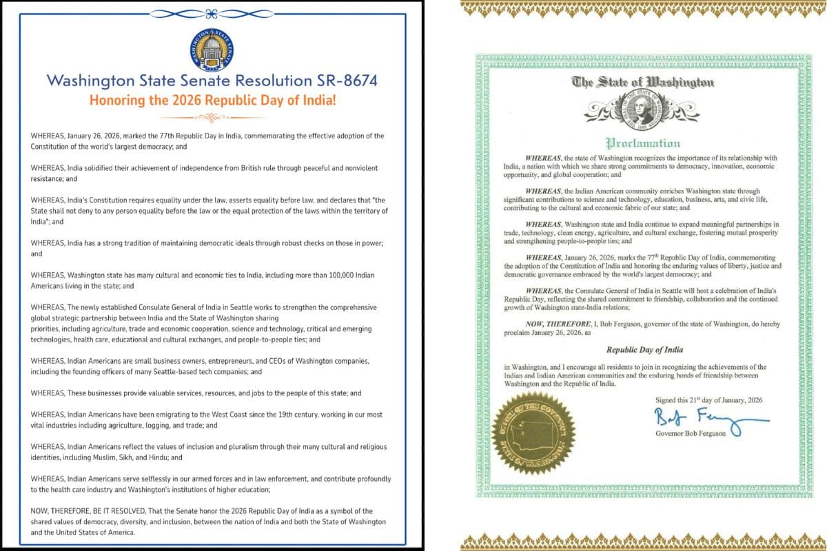 अमेरिका के वॉशिंगटन और अलास्का राज्यों के गवर्नरों ने भी 26 जनवरी 2026 को भारत के गणतंत्र दिवस के रूप में मान्यता दी. वॉशिंगटन के गवर्नर बॉब फर्ग्यूसन ने लोगों से भारतीय और भारतीय-अमेरिकी समुदाय की उपलब्धियों को सम्मान देने और भारत के साथ दोस्ती को याद करने की अपील की. अलास्का के गवर्नर माइक डनलीवी ने भी राज्य के लोगों से भारतीय समुदाय के योगदान को सराहने और भारत के साथ संबंधों को मजबूत मानने का आग्रह किया.
